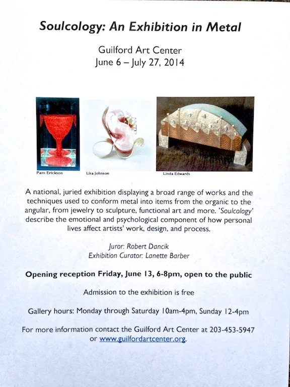 The premise for the show at the Guilford Art Center in Guilford, CT, Soulcology in Metals, is: how do the artist's personal emotions and psychology influence their work, in what ways do you see a transformation? Two of my pieces will be a part of this show.