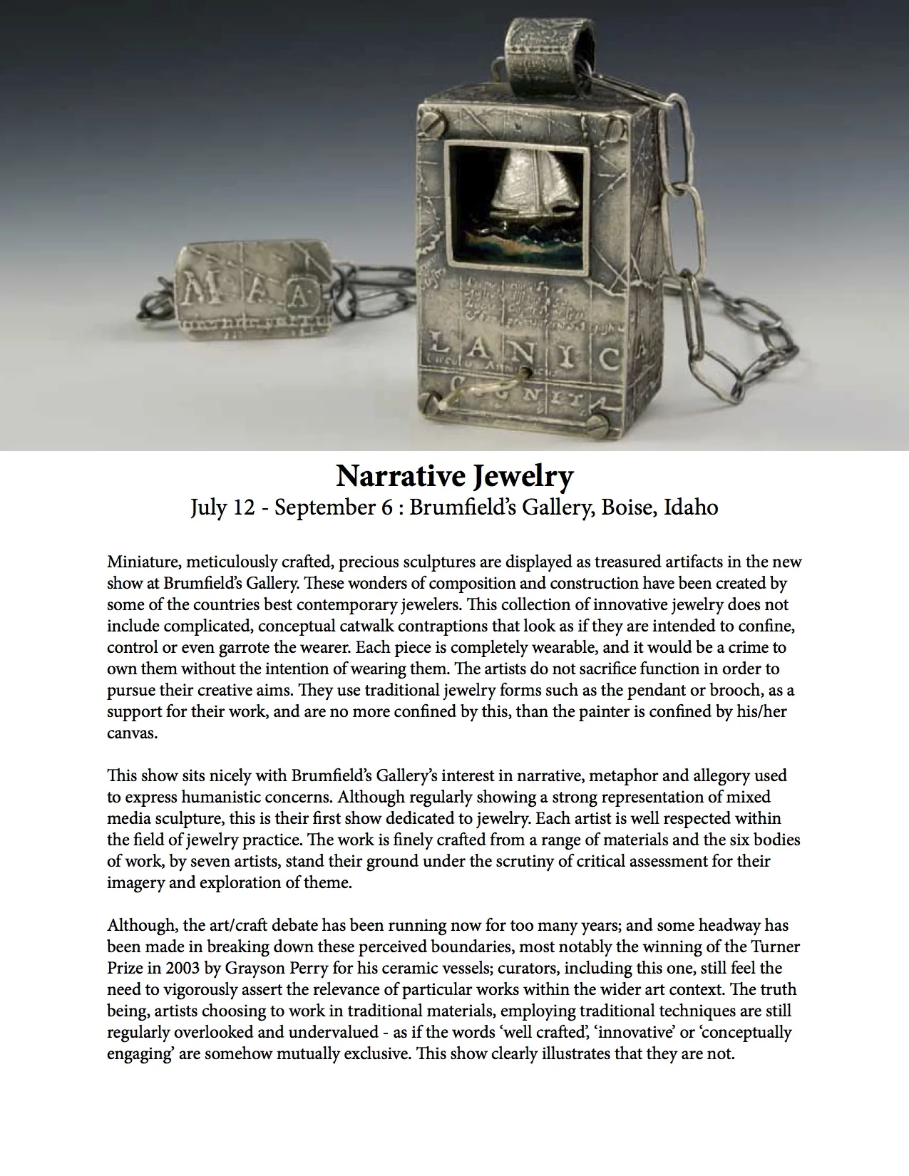 Goldsmith Mark Fenn curated "Tales from the Toolbox" , a showcase for narrative work, on view at crafhaus.