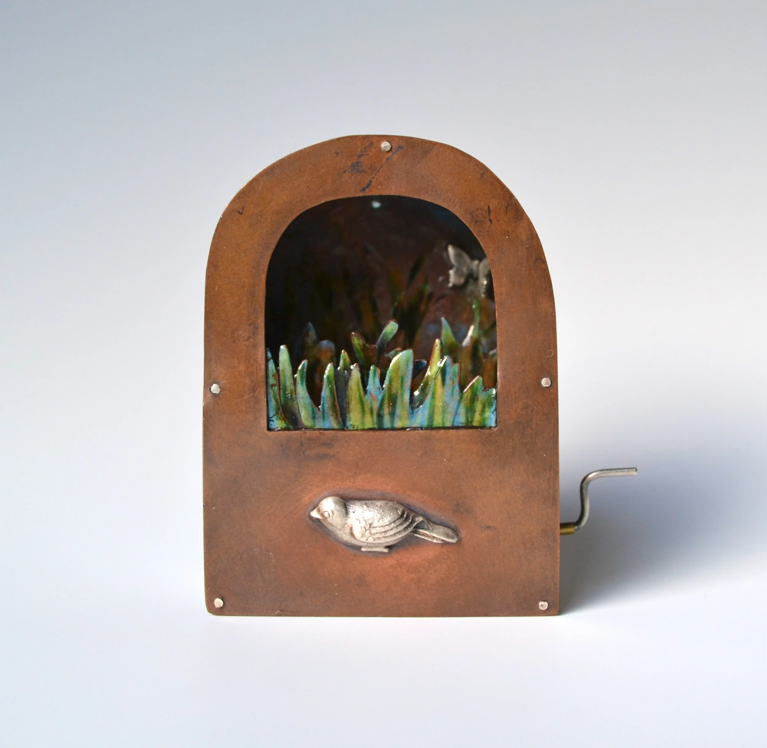 My grandmother was an avid gardener, loved canning tomatoes and pickles and drank her tea terrifyingly, scaldingly hot. Having "lived through the depression", she was quite comfortable peering through an empty toilet roll tube to enhance her vision. There were always home made cookies at her house, and sweets. She had the most unique and hilarious sense of humor I've ever encountered, which often centered around her selective hearing, and family gatherings were spent laughing so hard that we could barely breath. So much of who I am is because of her, and after she passed at age 99, I made this reliquary locket brooch to celebrate her extraordinary life. Turn the crank and grass blades move around as if growing...